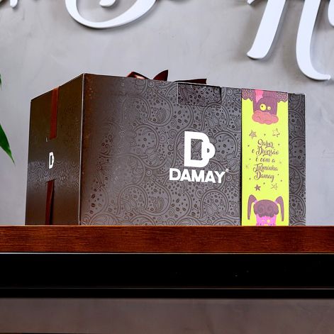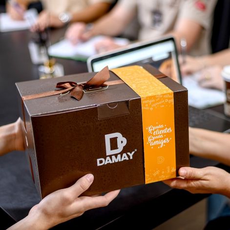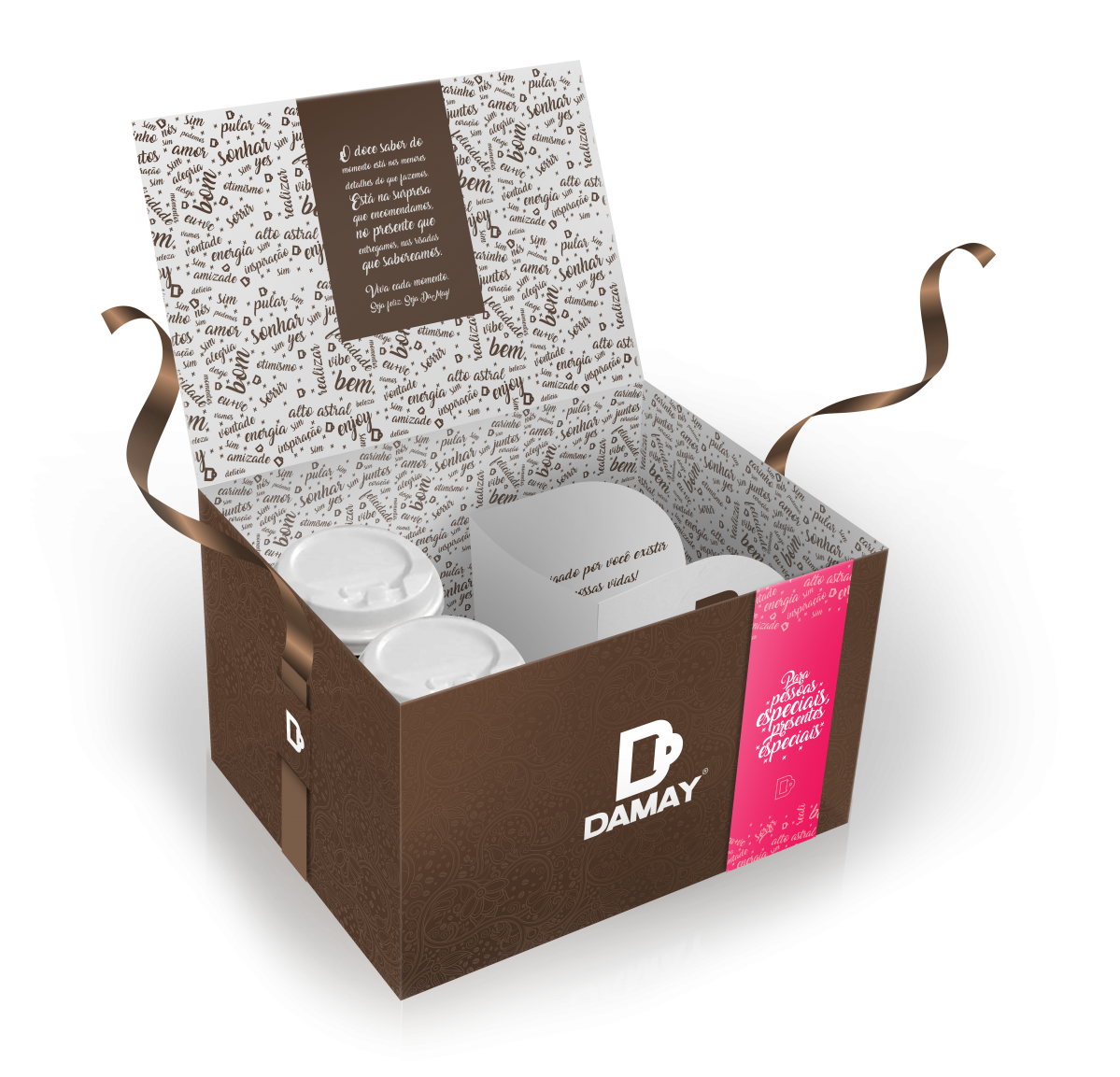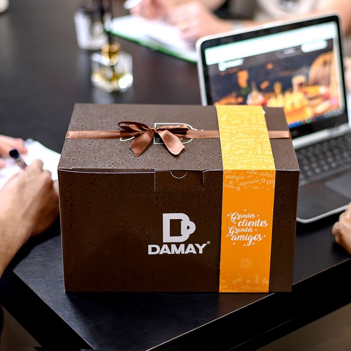 Um presente pra encantar. A Caixa Presente Damay é uma caixa linda pra você presentear pessoas especiais de uma forma bonita e saborosa! A Caixa Presente serve para as mais diversas ocasiões e dá a possibilidade de escolha de uma ampla variedade de presentes Damay, desde as fatias de tortas doces, salgadas, até mesmo bebidas para preparar e souvernirs. E o melhor é que ela se adapta pra qualquer ocasião. As caixas contam com diversas cintas temáticas: para presentear pessoas especiais, a criançada (com uma cinta divertida com a Turminha Damay), no Natal e até mesmo para presentear clientes em uma reunião de negócios. Seja no fim do ano, amigo secreto, reunião, aniversário ou qualquer ocasião, uma Caixa Presente Damay é sempre uma opção deliciosa e perfeita!