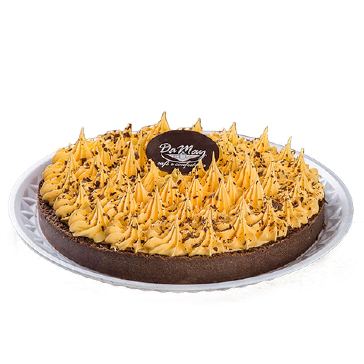 Casquinha amanteigada de chocolate com mousse de maracujá.