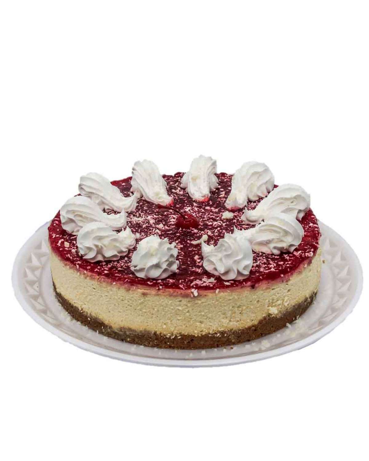 Massa de biscoito amanteigado com castanhas, Cream cheese e calda de frutas.