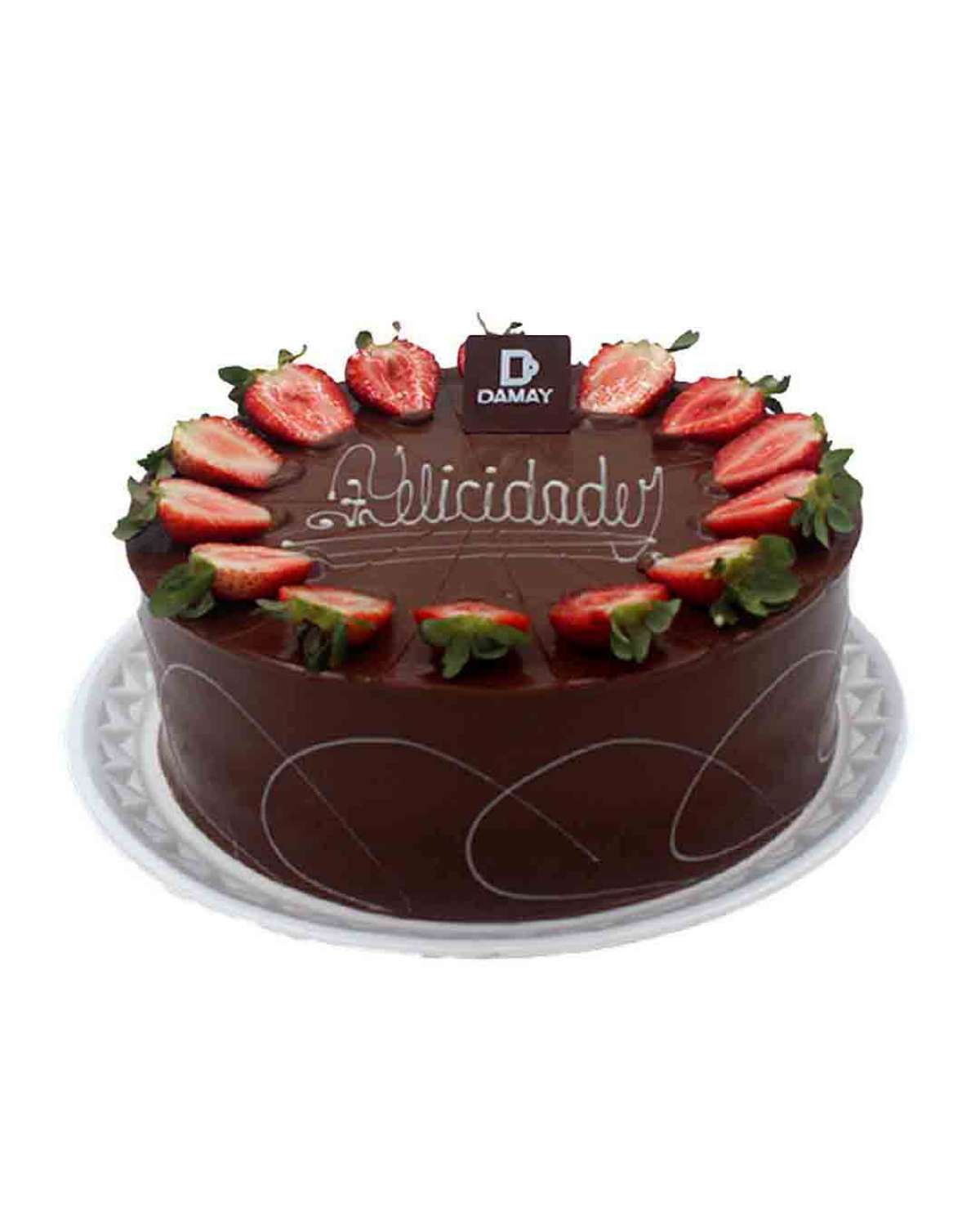 Massa de chocolate com morangos, nata e raspas de chocolate preto.
