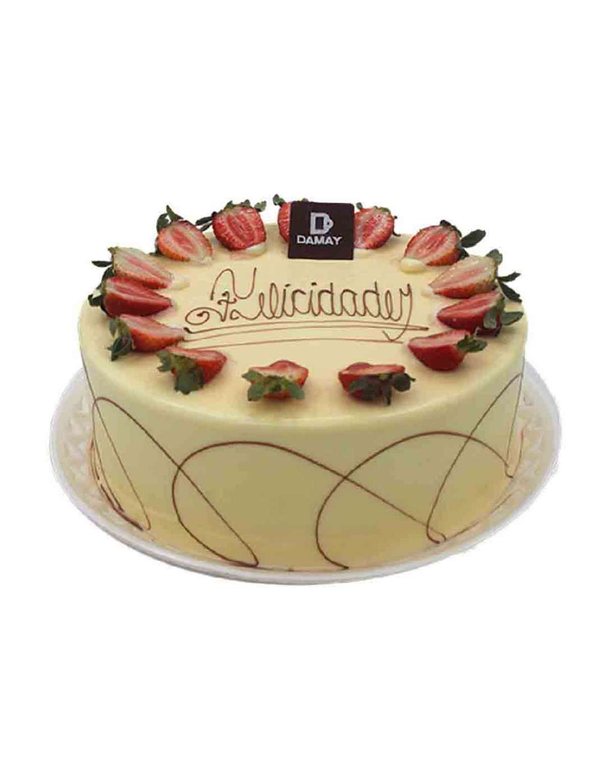 Massa branca com morangos, suspiro, nata e raspas de chocolate branco.
