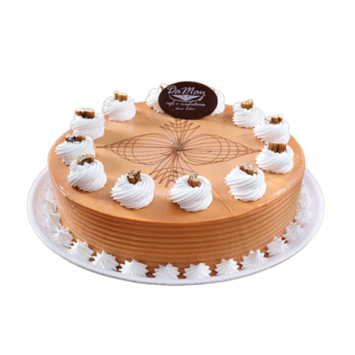 Pão de ló branco com creme especial de nozes e cobertura Toffe caramelo.